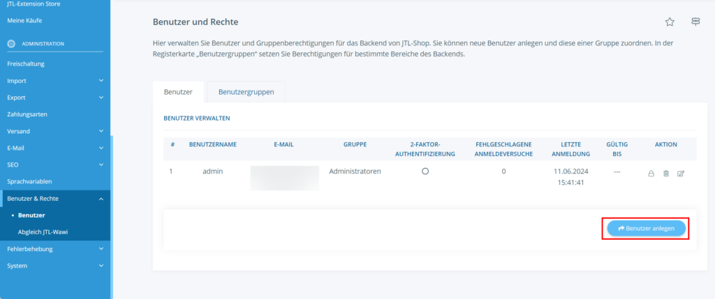 - Öffnen Sie im Backend von JTL-Shop über das Menü Administration > Benutzer & Rechte > Benutzer die Seite Benutzer und Rechte.