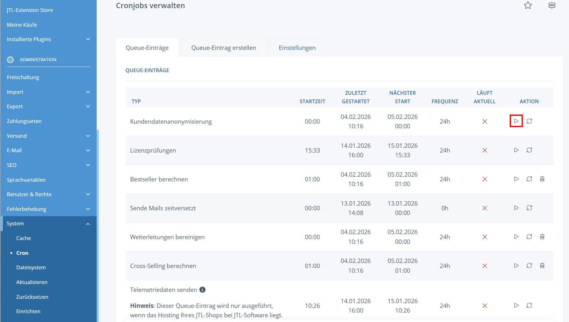 - Lizenzprüfungen: Dieser Queue-Eintrag aktualisiert alle 24 Stunden die Käufe, die Sie im JTL-Extension Store getätigt haben.