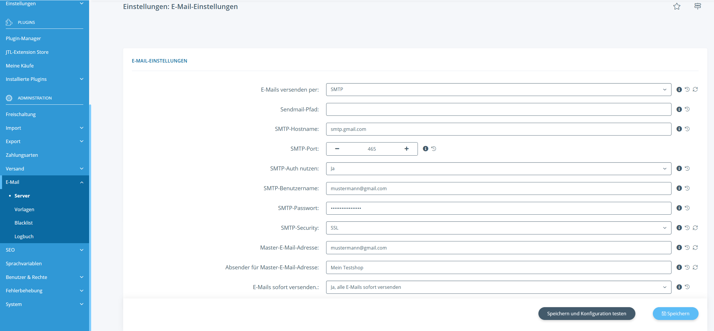 Falls Sie ein Gmail-Konto verwenden, müssen Sie Ihr Gmail-Konto per SMTP mit dem JTL-Shop verbinden. Lesen Sie mehr zum Thema hier: E-Mail-Versand konfigurieren (Gmail).