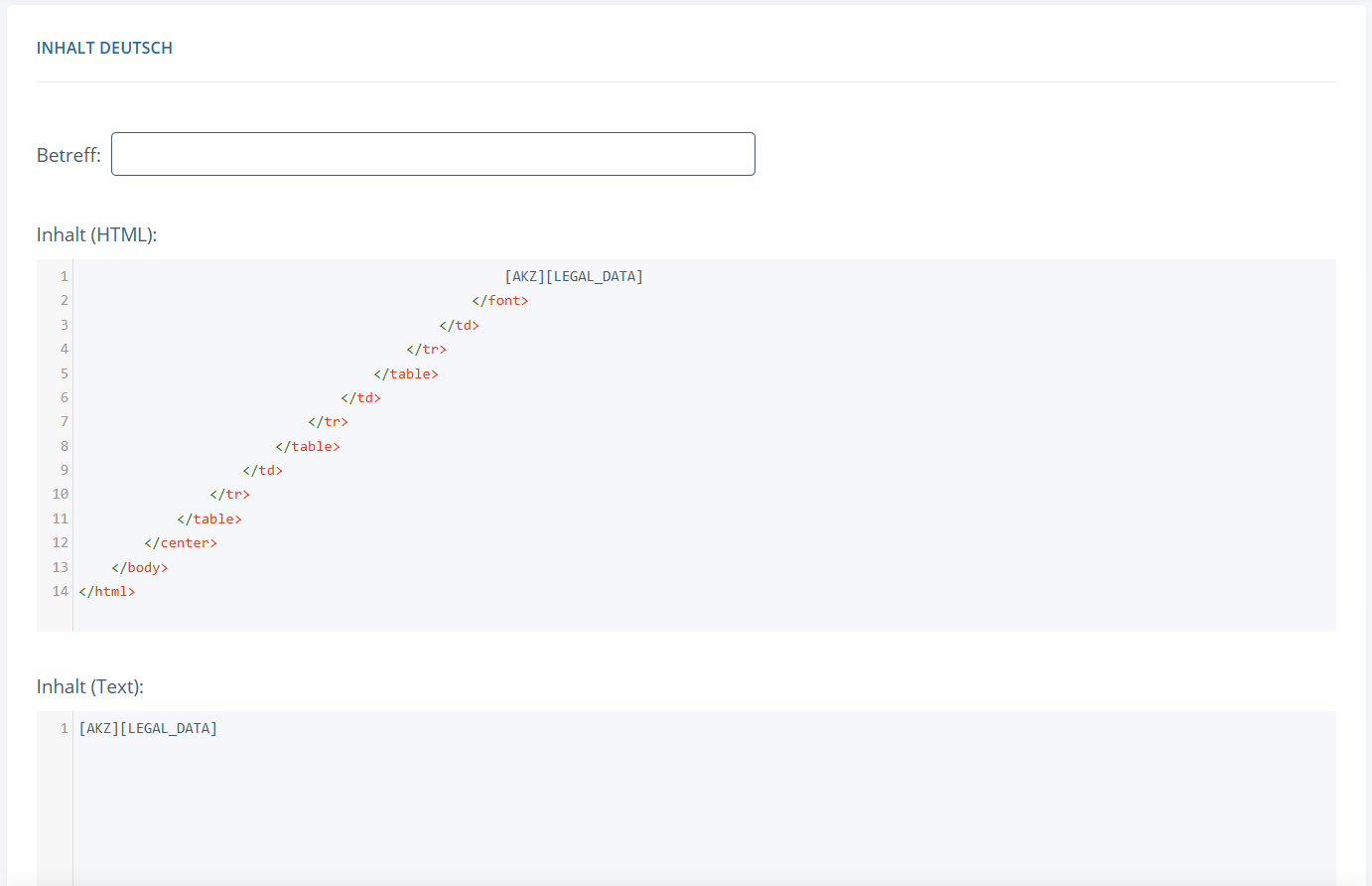 - Bearbeiten Sie den Inhalt in den Editoren Inhalt (HTLM) und Inhalt (Text), um den E-Mail-Text an Ihre Anforderungen anzupassen.
