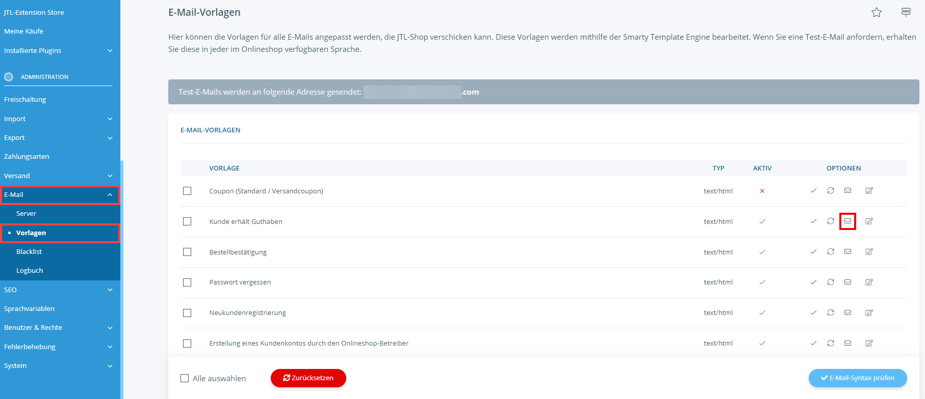 - Öffnen Sie im Backend von JTL-Shop über das Menü Administration > E-Mail > Vorlagen die Seite E-Mail-Vorlagen.