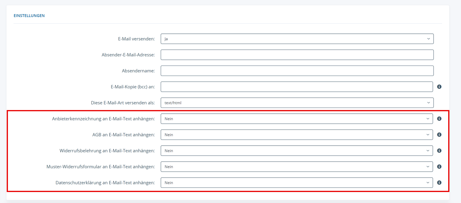 Sie haben erfolgreich eine Anbieterkennzeichnung, AGB, Widerrufsbelehrung, Muster-Widerrufsformular und/oder Datenschutzerklärung in den Footer von E-Mail-Vorlagen hinzugefügt und für mindestens eine E-Mail-Vorlage aktiviert.