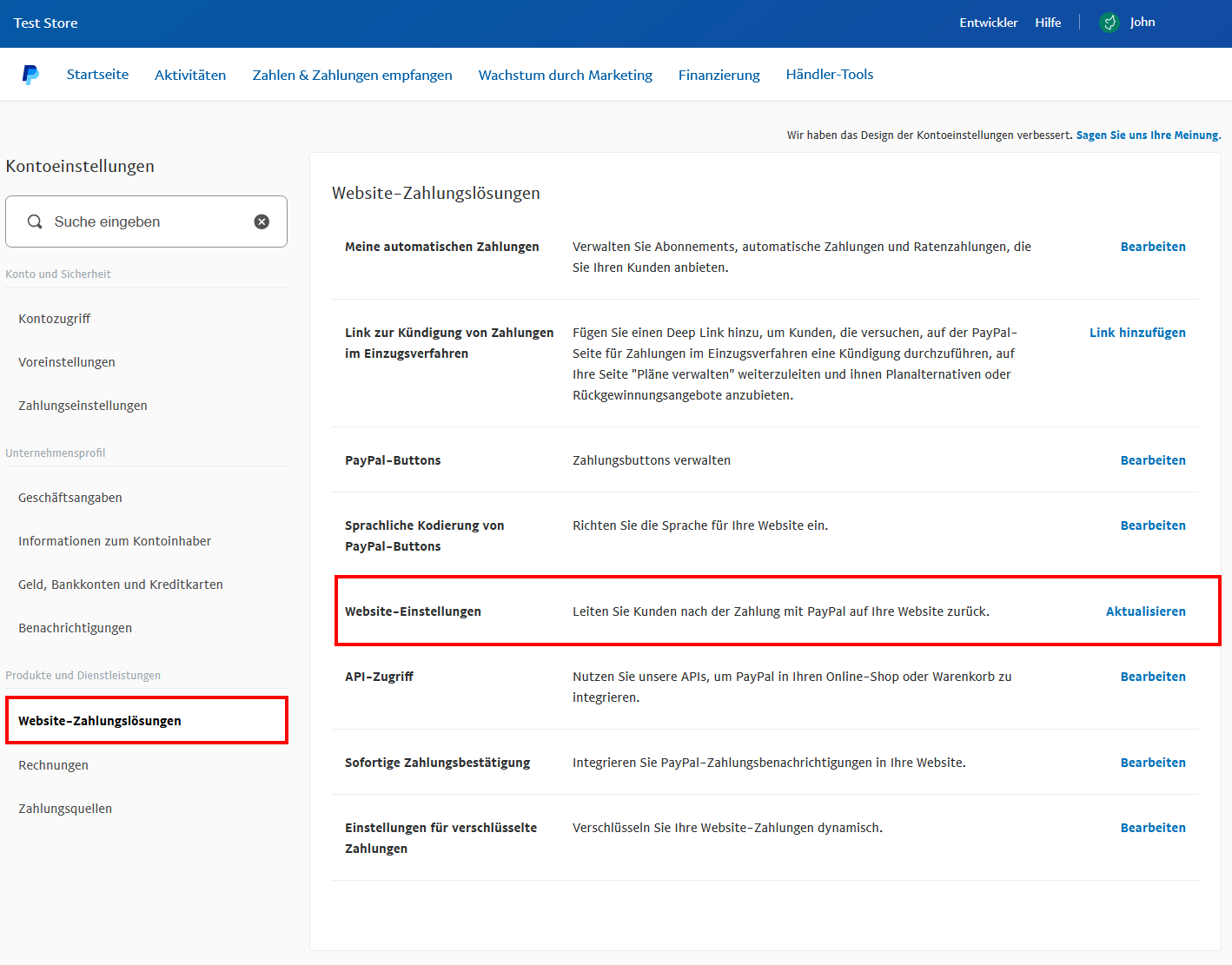 - Auf der neuen Seite Kontoeinstellungen, wechseln Sie in den Bereich Website-Zahlungslösungen.