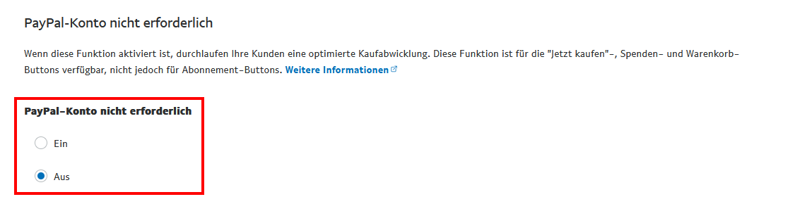 - Wählen Sie unter PayPal-Konto nicht erforderlich die Option Aus.