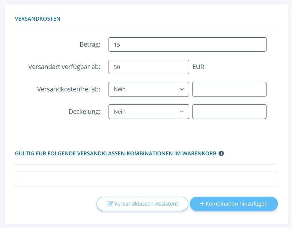 Gültig für folgende Versandklassen-Kombinationen im Warenkorb: Hier können Sie festlegen, für Artikel welcher Versandklasse die Versandart zur Verfügung stehen soll. Wenn die Versandart für alle Versandklassen verfügbar sein soll, klicken Sie in das Feld und wählen Sie Alle Kombinationen. Wenn Sie die Versandart auf bestimmte Kombinationen einschränken möchten, klicken Sie in das Feld und wählen Sie die Versandklassen für die erste Kombination. Klicken Sie anschließend auf Kombination hinzufügen, um eine Kombination der verfügbaren Versandklassen zu ergänzen. Wiederholen Sie diesen Schritt, bis Sie alle Kombinationen erstellt haben.
