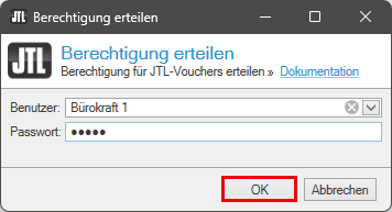 - Bitten Sie den Benutzer, im Feld Passwort sein JTL-Wawi-Passwort einzugeben. Geben Sie alternativ das Passwort selbst ein, wenn Sie dazu berechtigt sind.