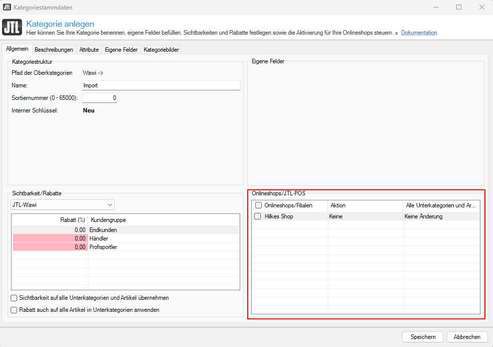 2. Sie sehen das Dialogfenster Kategoriestammdaten. Lassen Sie im Bereich Onlineshops/JTL-POS die Checkboxen für alle Shops und Verkaufsplattformen leer, damit die Kategorie nur in JTL-Wawi angezeigt wird.