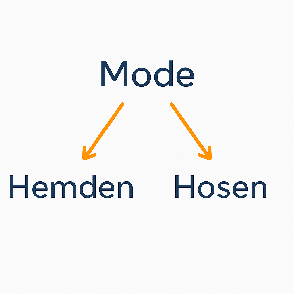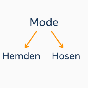 Sie haben zum Beispiel die Kategorie „Mode“. Die Kategorie „Mode“ enthält die beiden Kategorien „Hemden“ und „Hosen“. „Mode“ ist dann die Oberkategorie für die Kategorien „Hemden“ und „Hosen“. „Hemden“ ist dann eine Unterkategorie der Kategorie „Mode“.