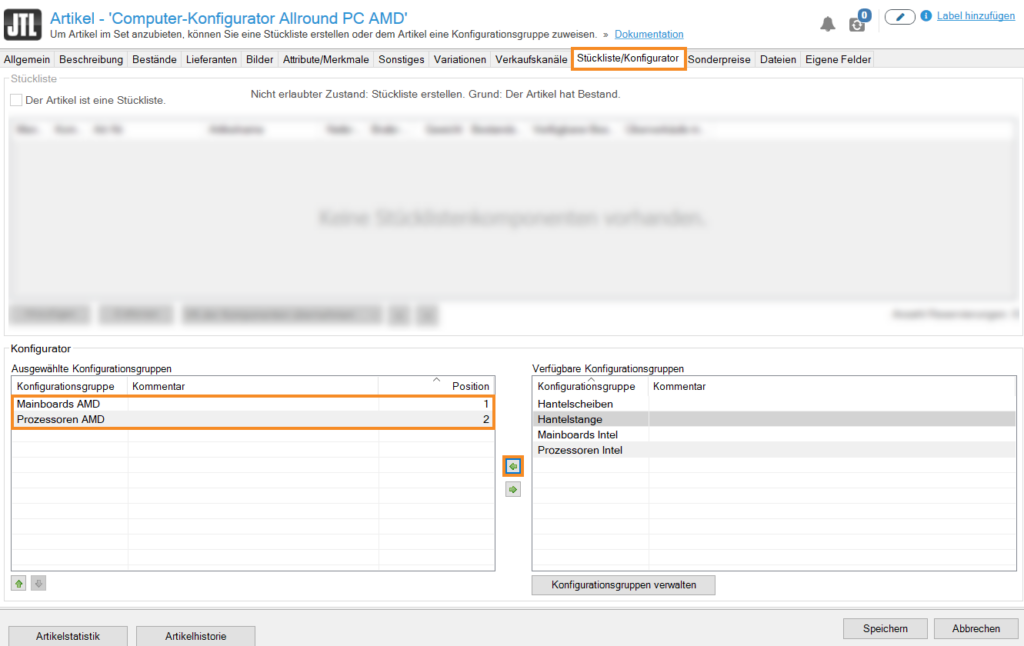 - Wechseln Sie in die Registerkarte Stückliste/Konfigurator.