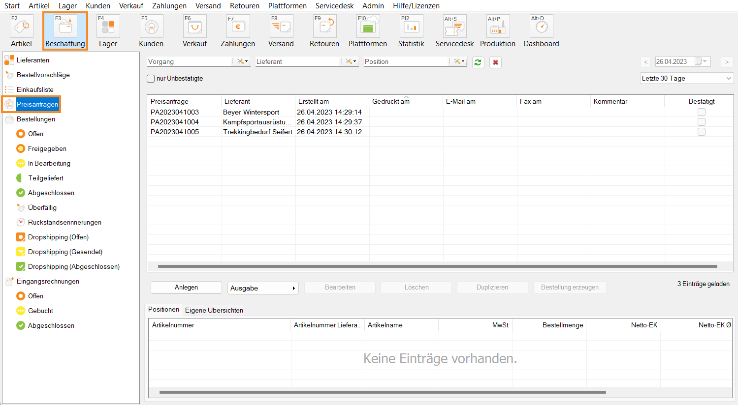 In der Kategorie Preisanfragen sehen Sie alle Anfragen zu Preisen, die Sie an Ihre Lieferanten gesendet haben. Sie können außerdem aus den einzelnen Preisanfragen Lieferantenbestellungen erzeugen.