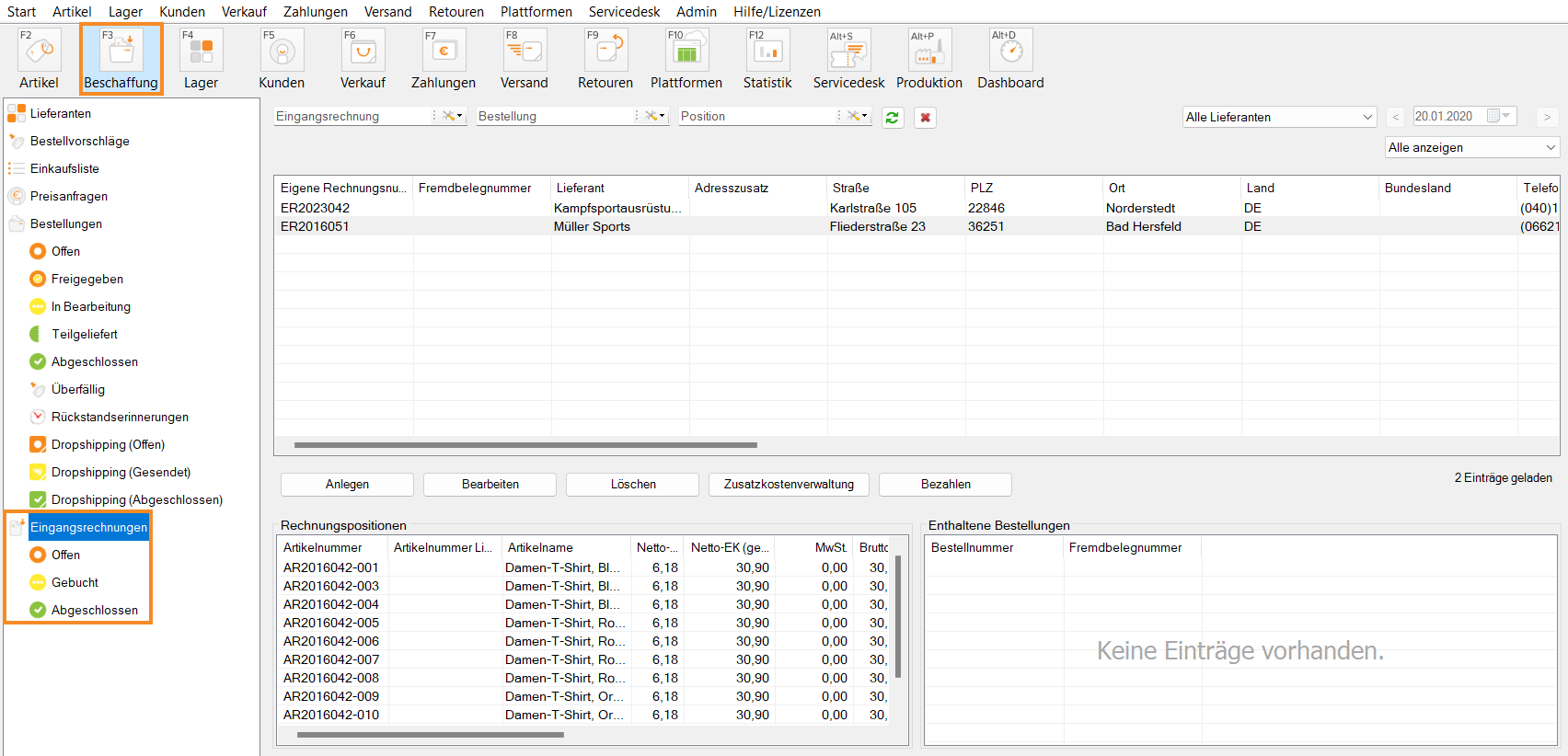 Über die Schaltfläche Beschaffung erreichen Sie die Lieferantenverwaltung. Hier haben Sie Zugriff auf alle wichtigen Informationen zu Ihren Lieferanten. Über das Dialogfenster Lieferantenstammdaten können Sie neue Lieferanten anlegen und alle Daten zu bestehenden Lieferanten pflegen und einsehen.