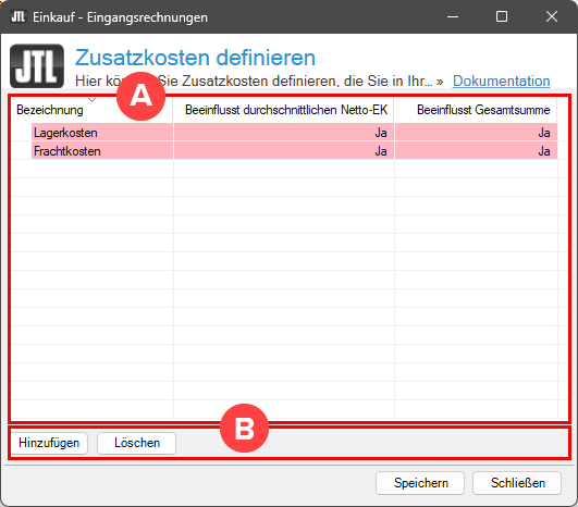 In dieser Dokumentation lesen Sie eine Detailbeschreibung der Funktionen im Dialogfenster Zusatzkosten definieren, auch Zusatzkostenverwaltung genannt. Sie können das Dialogfenster in JTL-Wawi im Bereich Beschaffung öffnen. Klicken Sie auf die Schaltfläche Beschaffung und öffnen Sie einen der Ordner Eingangsrechnungen. Klicken Sie dann auf die Schaltfläche Zusatzkostenverwaltung.