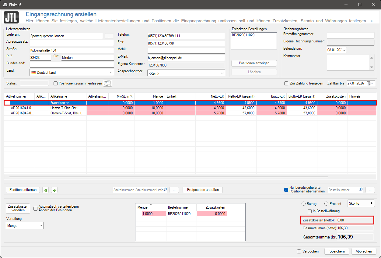 Sie bestellen 20 T-Shirts bei Ihrem Lieferanten. Zusätzlich berechnet der Lieferant 4,99 € Frachtkosten. Wenn Sie die Frachtkosten als normale Position erfassen, werden die Frachtkosten nicht auf den Einkaufspreis der T-Shirts angerechnet.