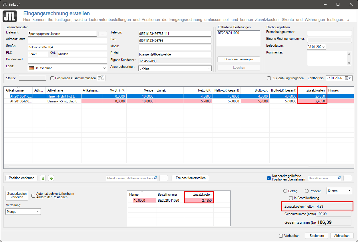Wenn Sie die Frachtkosten als Zusatzkosten erfassen, werden die Frachtkosten auf alle T-Shirts verteilt. Wenn Sie die Zusatzkosten entsprechend definiert haben, werden die Zusatzkosten in den durchschnittlichen Einkaufspreis einberechnet, nachdem Sie die Eingangsrechnung verbucht haben.