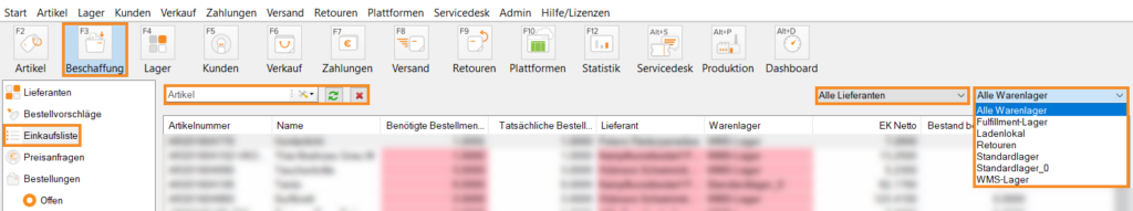 Warenlagerfilter: Wählen Sie ein Lager aus dem Dropdown-Menü aus. In der Listenansicht sehen Sie anschließend ausschließlich die Artikel, die für das gewählte Lager bestimmt sind.