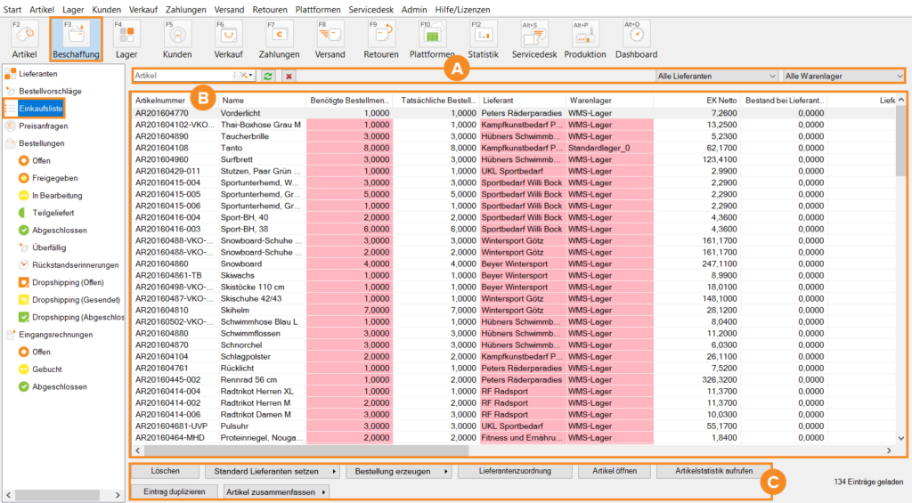 Hier werden Ihnen standardmäßig alle Artikel angezeigt, die auf die Einkaufsliste gesetzt wurden. Falls Sie Einstellungen in den Such- und Filterfunktionen (Bereich A) vorgenommen haben, werden Ihnen in dieser Liste ausschließlich Artikel entsprechend Ihrer Such- und Filterangaben angezeigt.