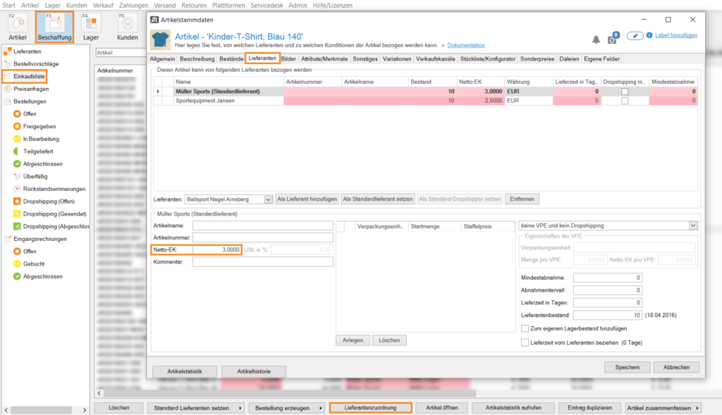 • Günstigsten Lieferanten setzen: Beim günstigsten Lieferanten spielen mehrere Kriterien eine Rolle. Zunächst der Einkaufspreis in der Lieferantenartikelzuordnung.