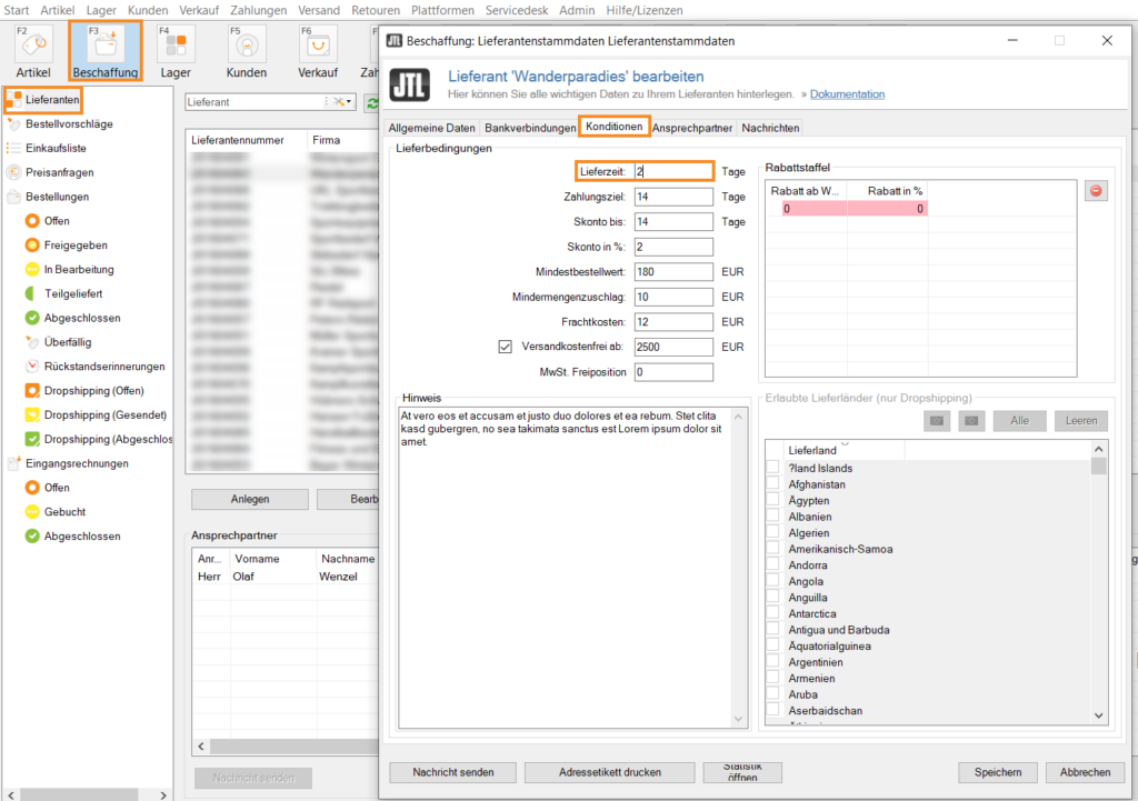 Sie haben die Lieferzeiten für einen bestimmten Lieferanten jetzt über die Lieferantenstammdaten bestimmt.