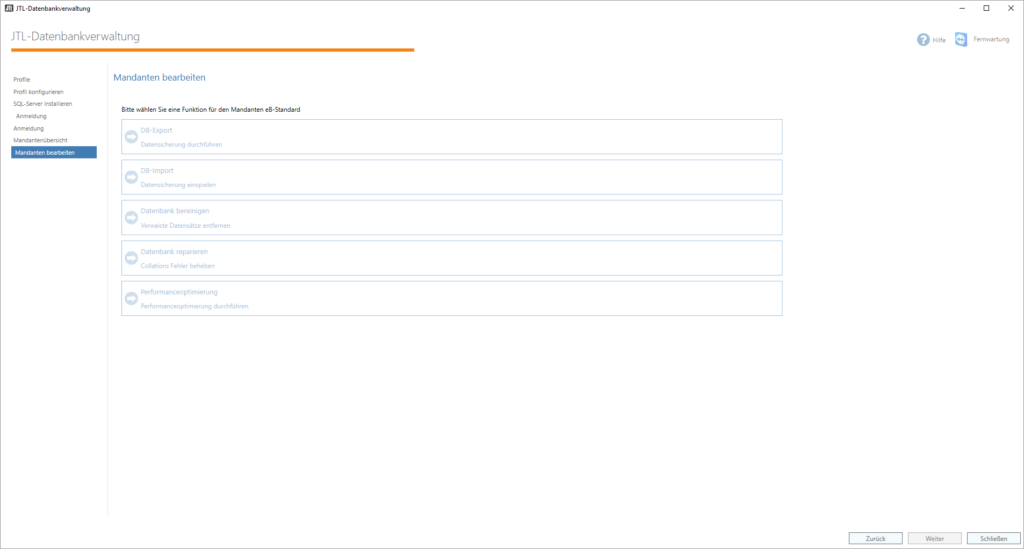 Nachdem die Datenbank „eazybusiness“ erstellt wurde, können Sie die Datenbankverwaltung schließen und JTL-Wawi starten. Sie gelangen in den Einrichtungsassistenten.