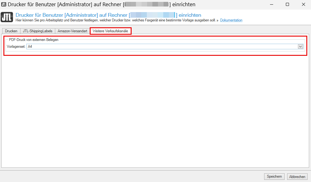 In dieser Dokumentation lesen Sie eine Detailbeschreibung der Funktionen im Dialogfenster Drucker einrichten > Weitere Verkaufskanäle. Sie erreichen das Dialogfenster in JTL-Wawi über das Menü Start > Drucker.