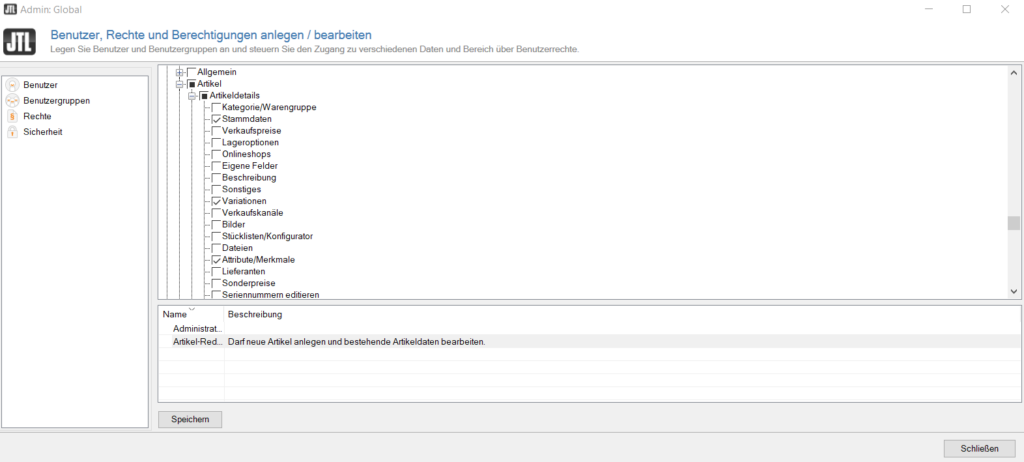 - Navigieren Sie in der Baumstruktur zum Eintrag Artikeldetails und erlauben Sie das Anlegen und Bearbeiten von Artikelstammdaten, das Erstellen von Varkombis sowie das Löschen von Artikeln. Kategorien soll diese Benutzergruppe nicht anlegen oder bearbeiten dürfen.