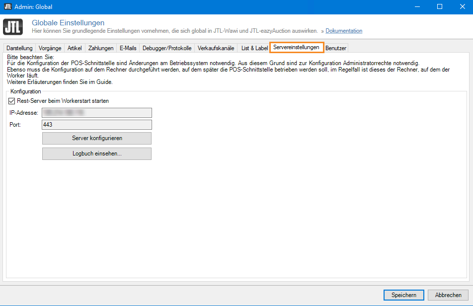 IP-Adresse/Port: Hier sehen Sie die konfigurierten Daten für Ihren POS-Server. Bis zur Konfiguration bleiben beide Felder leer.