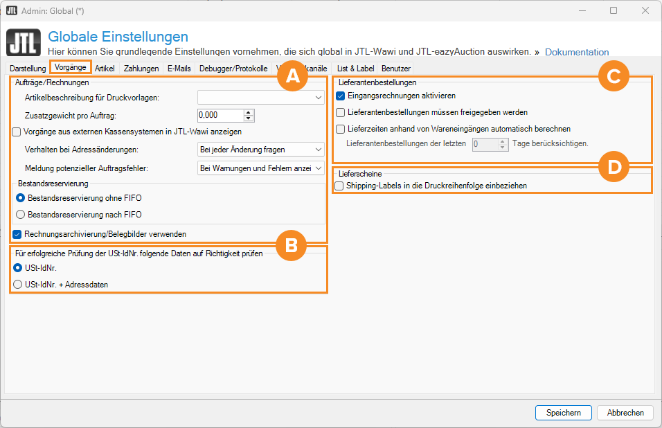 In dieser Dokumentation lesen Sie eine Detailbeschreibung der Funktionen im Dialogfenster Globale Einstellungen zur Registerkarte Vorgänge. Sie erreichen das Dialogfenster in JTL-Wawi über Menü Admin > Globale Einstellungen > Registerkarte: Vorgänge.