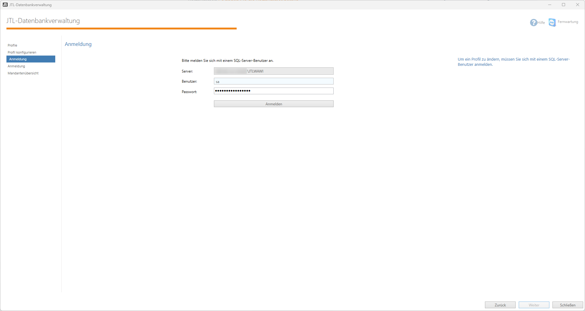 Benutzer: Tragen Sie hier den Benutzernamen ein, welcher bei der Installation des Haupt-Clients verwendet wurde. Standard: sa