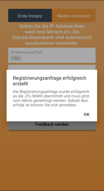 Ihre Registrierungsanfrage wurde erfolgreich an Ihren JTL-Admin übermittelt. Warten Sie bitte, bis Ihr JTL-Admin Ihre Registrierungsanfrage bestätigt wurde. Andernfalls wird die Registrierungsanfrage abgebrochen.