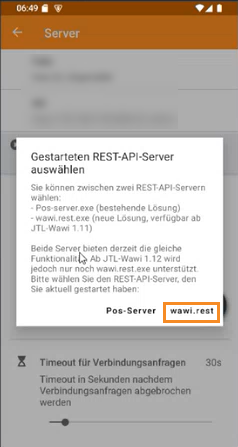 - Tippen Sie im Abfragedialog Gestarteten REST-API-Server auswählen auf wawi.rest.