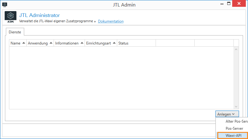 - Klicken Sie auf die Schaltfläche Anlegen und wählen Sie im Dropdown-Menü Wawi-API aus.