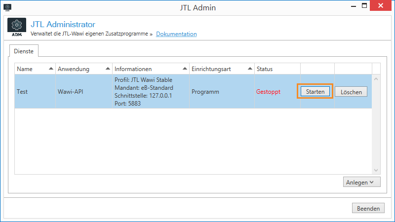 Sobald der Status „Wird ausgeführt“ erscheint, haben Sie erfolgreich den Server gestartet. Im nächsten Abschnitt treffen Sie die Vorbereitungen in JTL-Wawi.