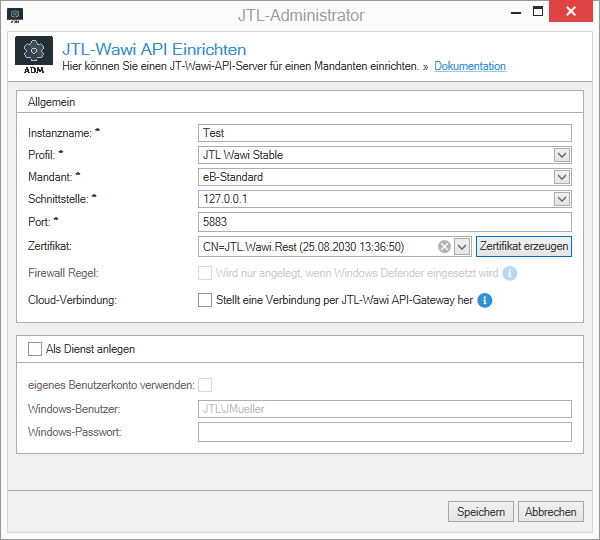 - Geben Sie im neuen Dialogfenster JTL-Wawi API einrichten einen Instanznamen ein.