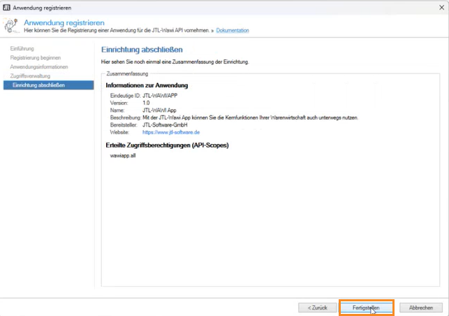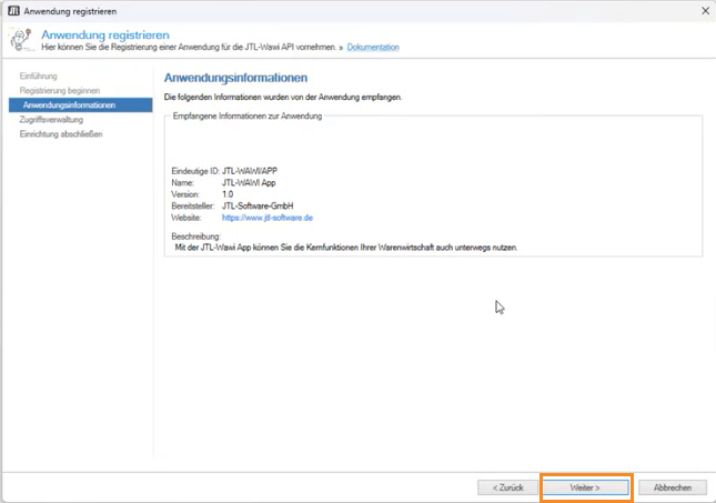 - Sie sehen im vorbereiteten JTL-Wawi-Dialogfenster Anwendung registrieren die neue Seite Anwendungsinformationen.