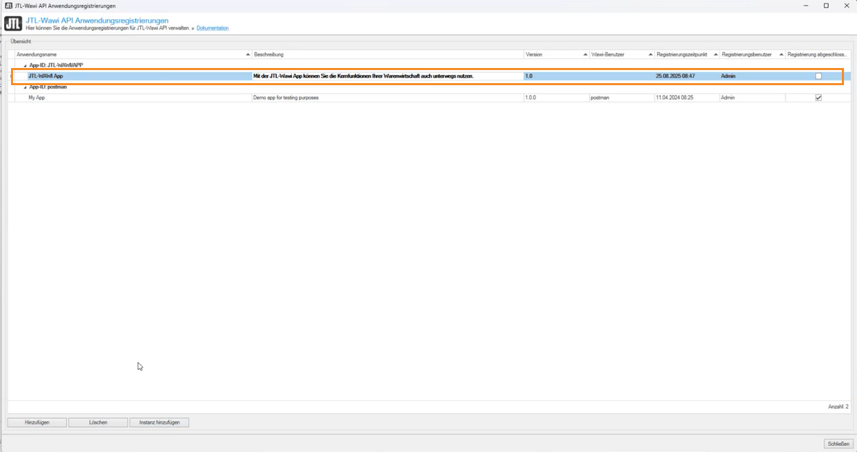 Sie kehren zum Dialogfenster JTL-Wawi API Anwendungsregistrierungen zurück. In der Übersicht sehen Sie nun die JTL-Wawi App Instanz. Die Anfrage vom Appnutzer wurde erfolgreich angenommen und es besteht kein weiterer Handlungsbedarf für den JTL-Admin.