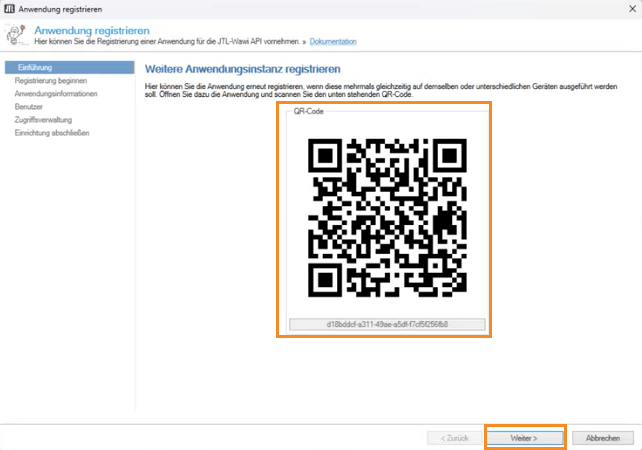 - Im neuen Dialogfenster Anwendung registrieren auf der Seite Einführung sehen Sie einen QR-Code und darunter die Registrierungs-ID. Senden Sie diese Informationen an den Appnutzer, damit dieser die Registrierung anfragen kann.
