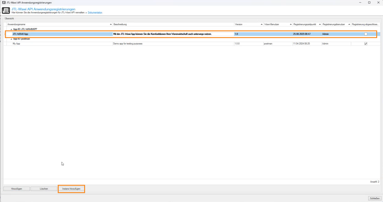 - Markieren Sie in der Übersicht JTL-Wawi App und klicken Sie auf die Schaltfläche Instanz hinzufügen, um den Registrierungsassistenten zu starten.
