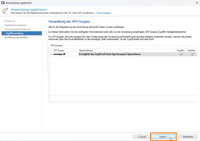 - Stellen Sie auf der neuen Seite Zugriffsverwaltung die Berechtigungen für den Appnutzer ein und klicken Sie auf die Schaltfläche Weiter.