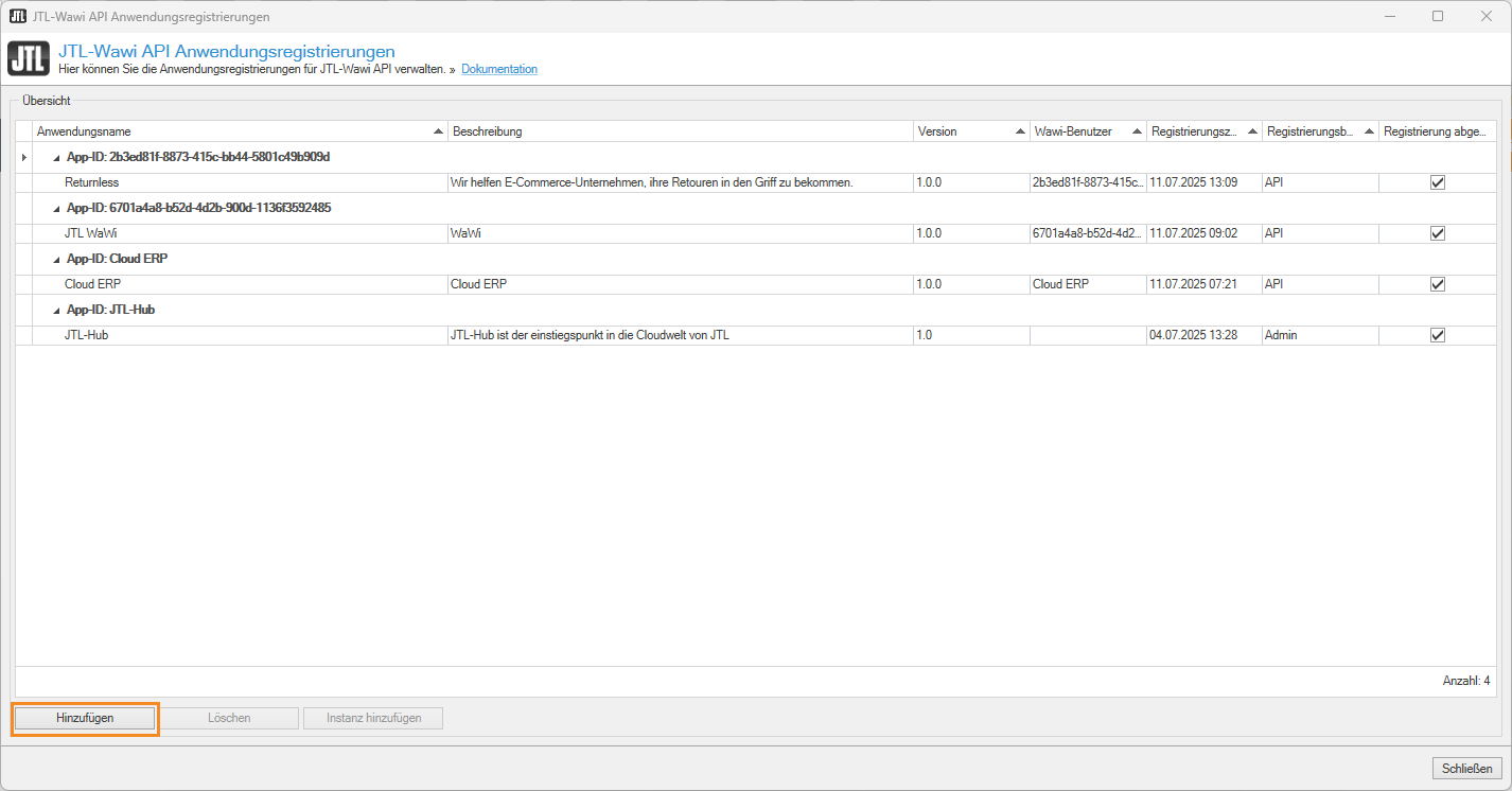 Erste Instanz JTL-Wawi App registrieren