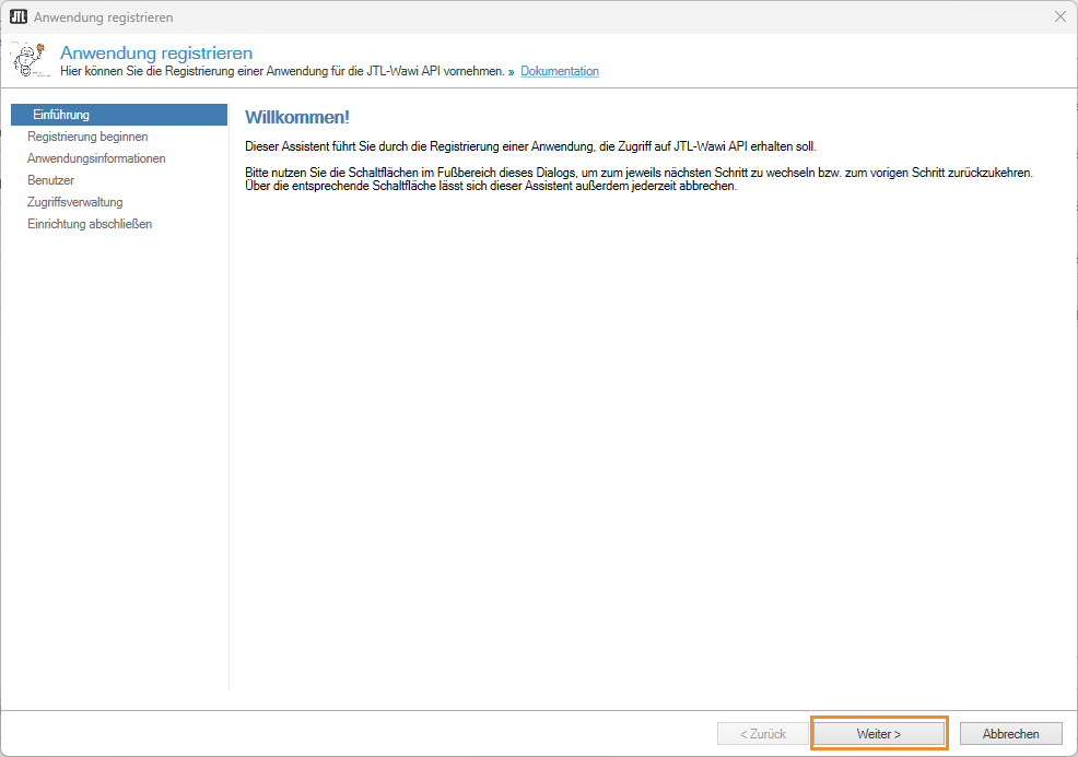 - Sie sehen im neuen Dialogfenster Anwendung registrieren die Seite Einführung. Klicken Sie auf die Schaltfläche Weiter.