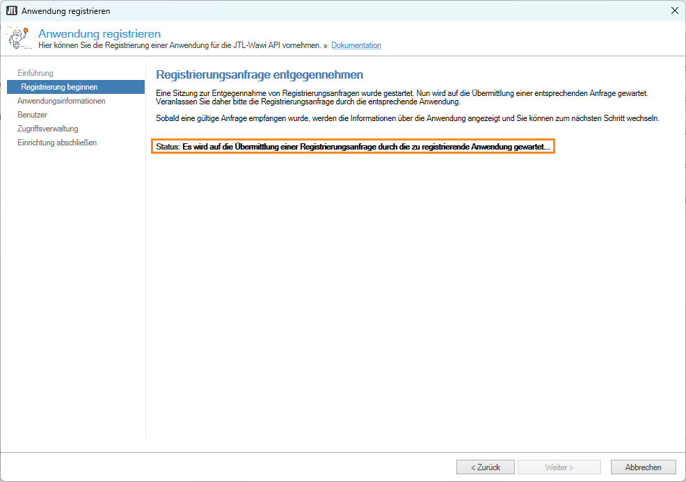 Sie sehen die Seite Registrierung beginnen und warten nun, bis der Appnutzer die Registrierungsanfrage gesendet hat.