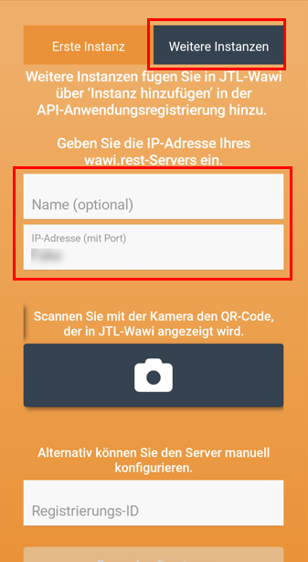 Bevor Sie ein weiteres Gerät registrieren können, müssen Sie bereits ein Gerät registriert haben. Siehe Erste Instanz JTL-Wawi App registrieren