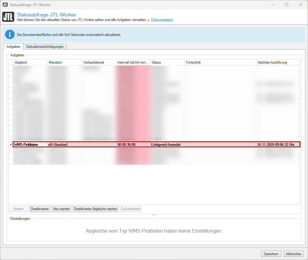 Damit automatische Picklisten erstellt werden können, muss WMS-Picklisten gestartet sein. Durch einen Doppelklick auf die Zeit in der Spalte Intervall legen Sie fest, in welchen zeitlichen Abständen der JTL-Worker einen Abgleich durchführt und dadurch die automatische Erstellung der Picklisten startet.