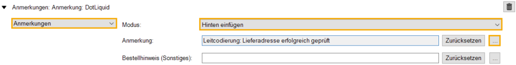 - Klicken Sie bei Anmerkung: in das Textfeld und schreiben Sie Ihre Anmerkung für eine Erfolgreiche Überprüfung. In unserem Beispiel schreiben wir Leitcodierung: Lieferadresse erfolgreich geprüft.