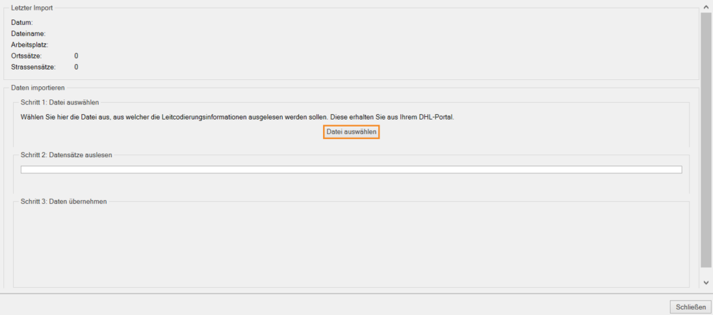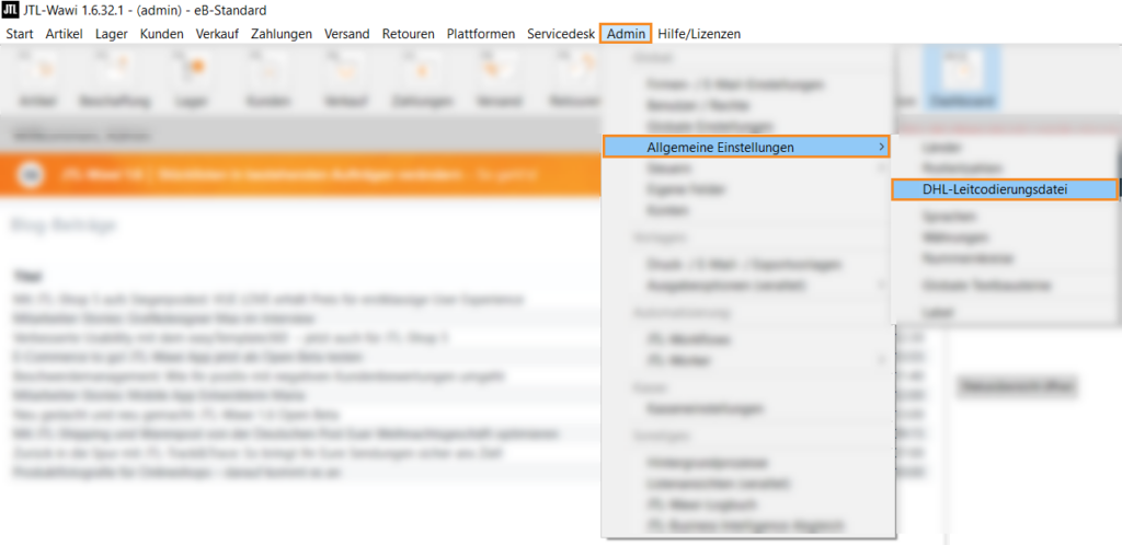 - Wählen Sie in JTL-Wawi Admin > Allgemeine Einstellungen > DHL-Leitcodierungsdatei.