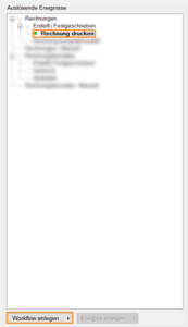 - Markieren Sie das Ereignis Rechnungen > Erstellt/Festgeschrieben und klicken Sie auf die Schaltfläche Workflow anlegen.