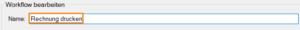 - Geben Sie Ihrem Workflow einen eindeutigen Namen. Klicken Sie dazu im Fensterbereich Workflow bearbeiten in das Textfeld bei Name:. In unserem Beispiel nennen wir es Rechnung drucken.