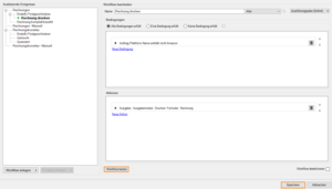 Wählen Sie im Fensterbereich der auslösenden Ereignisse Ihren Workflow Rechnung drucken. In dem Fensterbereich Bedingungen legen wir über Neue Bedingung unsere Regeln für den Workflow fest.
