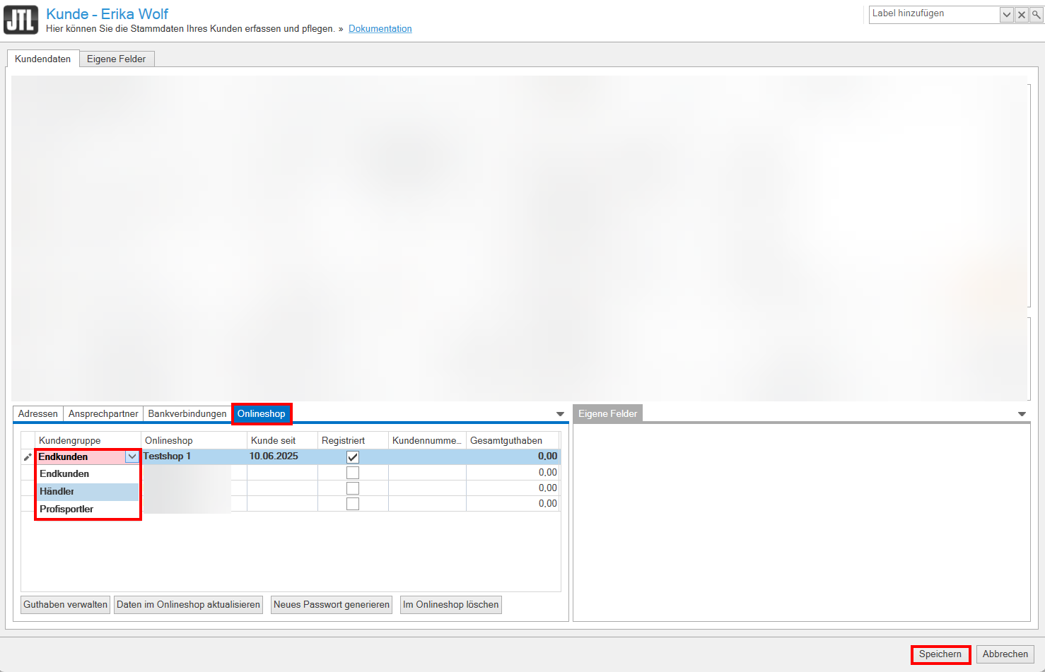 Die Änderung der Kundengruppe wird sofort an JTL-Shop übertragen. Sie haben erfolgreich die Kundengruppe einer Onlineshop-Kundin geändert.