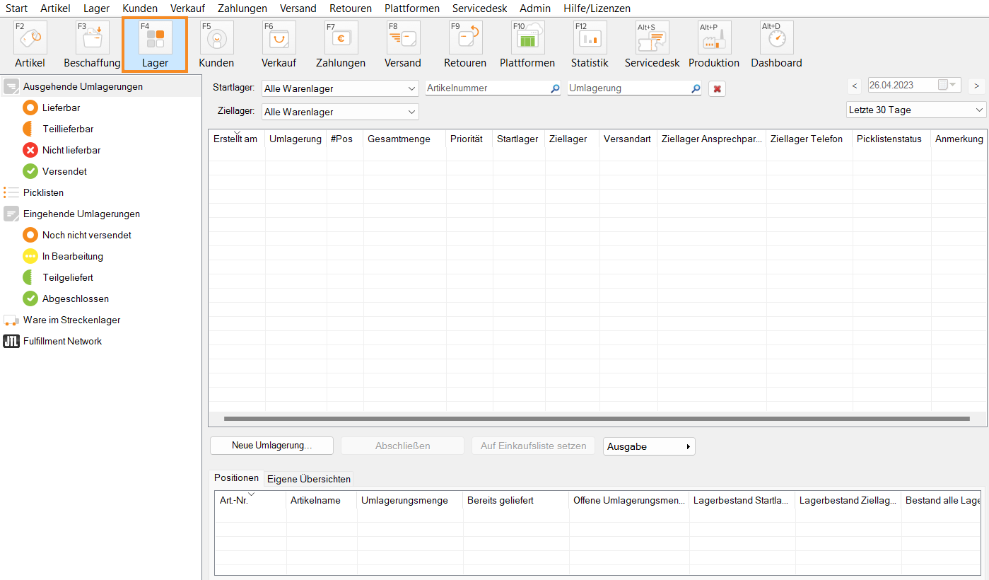Darüber hinaus können Sie im Bereich Lager jederzeit Umlagerungen zwischen zwei Warenlagern anstoßen. Mithilfe von Streckenlagern behalten Sie auch Ware im Blick, die sich aktuell unterwegs zwischen zwei Lagern befindet.
